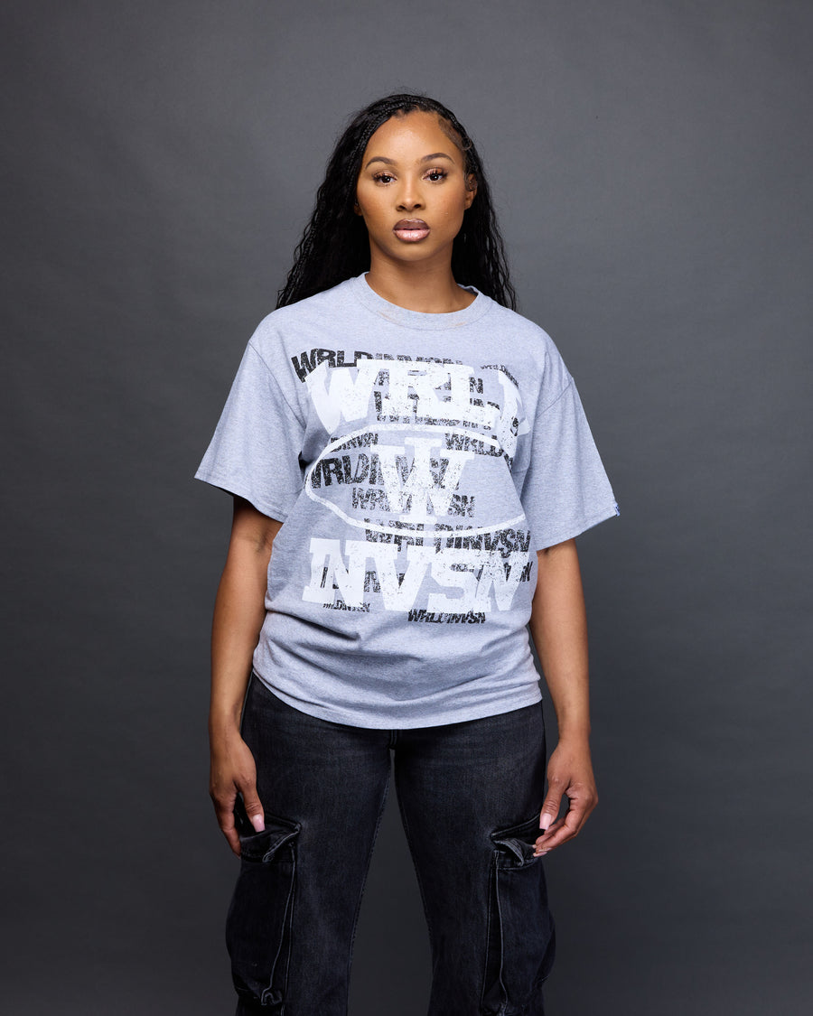 We've created this to be a vintage print. Stacking multiple WRLDINVSN logo!